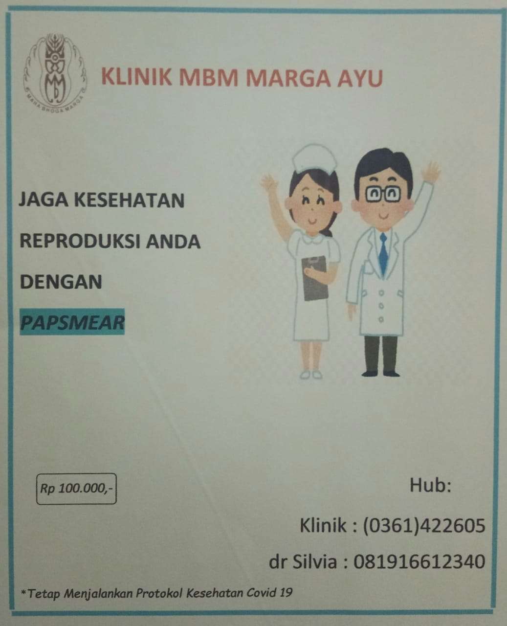 Pentingnya tetap menjaga kesehatan reproduksi di tengah pandemic Covid-19 saat ini salah satunya dengan papsmear. Kami memberikan layanan untuk papsmear dengan datang langsung ke "Klinik MBM Marga Ayu".