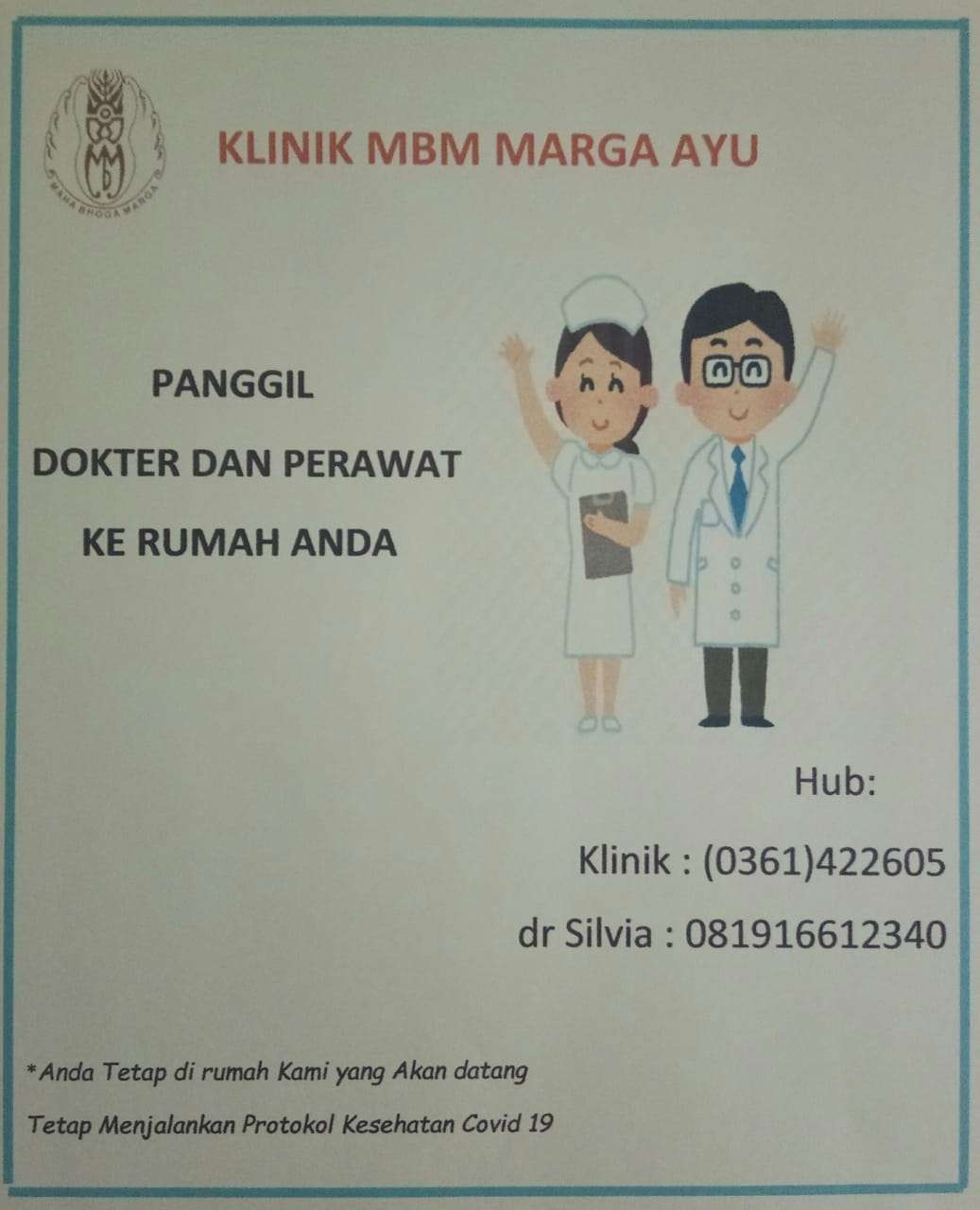 Mulai hari ini "Klinik MBM Marga Ayu" menerima panggilan Dokter dan Perawat ke rumah anda.
